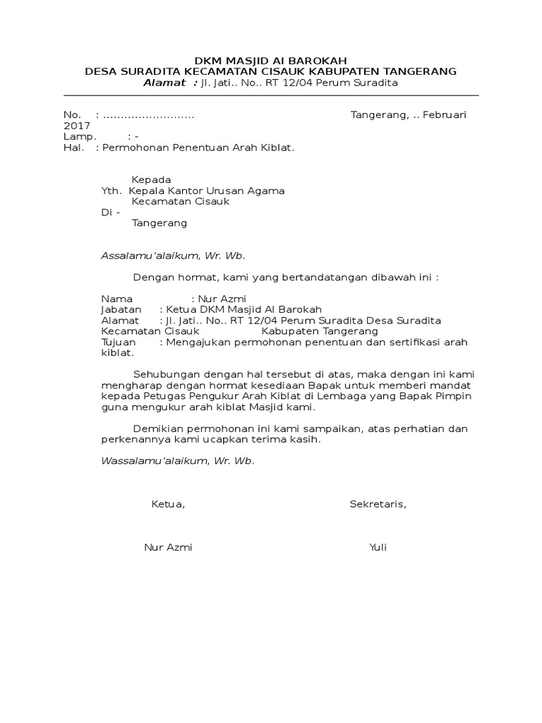 Sehubungan dengan terbentuknya organisasi ikatan remaja masjid nurul yaqien tassilli (ikranul), maka dengan ini kami memohon kepada pengurus dpdes bkprmi desa pattallassang kecamatan. Agar permohonan tersebut dikabulkan maka kita harus membuat sebuah surat. Contoh surat permohonan sk susunan pengurus. Jika tujuan surat pengajuan surat ke putusan untuk pengangkatan pengurus baru, maka lampirkan daftar pengurus tersebut. Contoh surat » surat permohonan » contoh surat permohonan bantuan dana pembangunan masjid. Demikian surat permohonan ini kami buat, besar harapan kami agar bapak ikut berpartisipasi mendukung berjalannya proses pembanguan masjid. Contoh surat pribadi permohonan mengurus ktp. Wungu, madiun yang insya allah akan mulai dilaksanakan pada Pada kesempatan ini admin ingin berbagi contoh surat dengan kategori baru, yaitu surat yang merupakan salah satu syarat yang harus dilampirkan dalam permohonan penerbitan sertifikat bpjs kesehatan. Sertifikat bpjs atas nama yayasan. Berikut ini adalah contoh surat permohonan. Maka dari itu kami mengajukan permohonan sk ukm lembaga dakwah kampus raudlatul muttaqin pada kepengurusan yang baru yaitu kepengurusan 2014/2015. Idealnya struktur sebuah lembaga yang bernama masjid dibentuk.